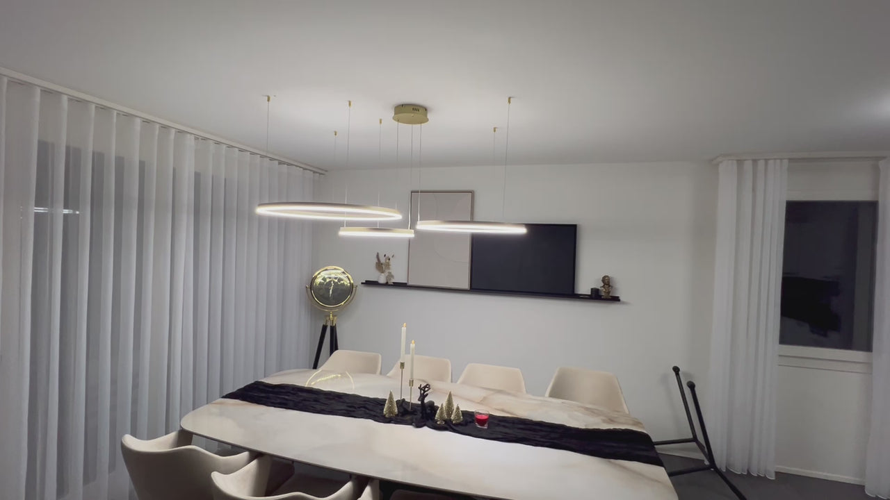 Die Rondello 4-Ring LED-Hängelampe vereint modernes Design mit ausgezeichneter Funktionalität. Mit ihren drei unterschiedlich großen Ringen (20-40-60-80 cm) sorgt sie für ein harmonisches Lichtspiel, das stilvoll in jedem Raum wirkt.